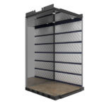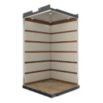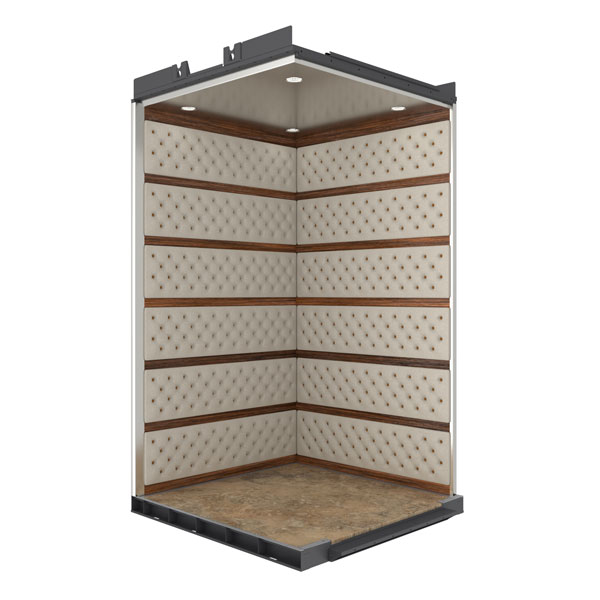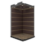 این مدل از کابین مورد استفاده در آسانسور پکیج داکسون ازسنگ مرمریت نسکافه ای بعنوان کفپوش استفاده میکند که از استحکام و زیبایی مناسبی برخوردار است . جهت ساختن پنل دیواره ها ازچرم لمسه دوزی و چوب قهوه ای استفاده شده است و ضمن اینکه دیواره ورودی از جنس استیل خشدار نقره ای می باشد . به منظور افزایش زیبایی محیط داخلی و ایجاد فضایی مناسب و زیبا ، جهت ساخت پنل پشت از چرم لمسه دوزی و چوب قهوه ای استفاده شده است.پاخور این کابین از جنس چوب قهوه ای است و جهت افزایش زیبایی داخلی آن از نور مستقیم LED استفاده شده است که دارای طول عمر بالا و نوردهی مناسب هستند و مصرف برق بسیار پایینی دارند .در ساخت و طراحی این کابین مانند سایر کابین های استفاده شده در آسانسور پکیج داکسون سعی بر این شده تا تمامی ضوابط و استاندارد های مربوط به آسانسور رعایت شود.