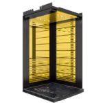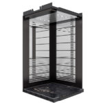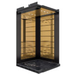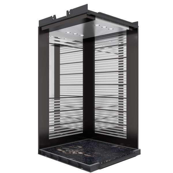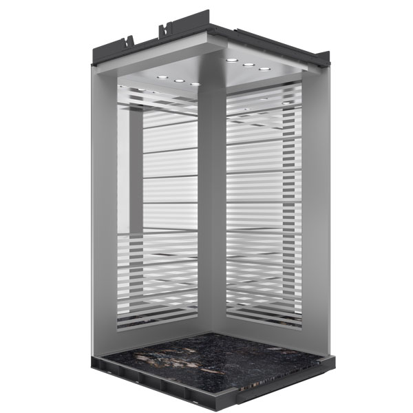 این مدل از کابین مورد استفاده در آسانسور پکیج داکسون ازسنگ متالیک بعنوان کفپوش استفاده میکند که از استحکام و زیبایی مناسبی برخوردار است . جهت ساختن پنل دیواره ها ازاستیل راه راه نقره ای و استیل خشدار دودی استفاده شده است و ضمن اینکه دیواره ورودی از جنس استیل خشدار دودی می باشد . به منظور افزایش زیبایی محیط داخلی و ایجاد فضایی مناسب و زیبا ، جهت ساخت پنل پشت از استیل راه راه نقره ای و استیل خشدار دودی استفاده شده است.پاخور این کابین از جنس استیل خشدار دودی است و جهت افزایش زیبایی داخلی آن از نور مستقیم LED استفاده شده است که دارای طول عمر بالا و نوردهی مناسب هستند و مصرف برق بسیار پایینی دارند .در ساخت و طراحی این کابین مانند سایر کابین های استفاده شده در آسانسور پکیج داکسون سعی بر این شده تا تمامی ضوابط و استاندارد های مربوط به آسانسور رعایت شود.